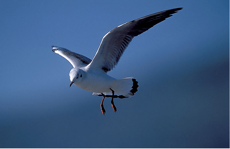 το κομψό κύρτωμα των λευκών φτερών, καθώς πολιορκούνται από το βαθύ μπλε.